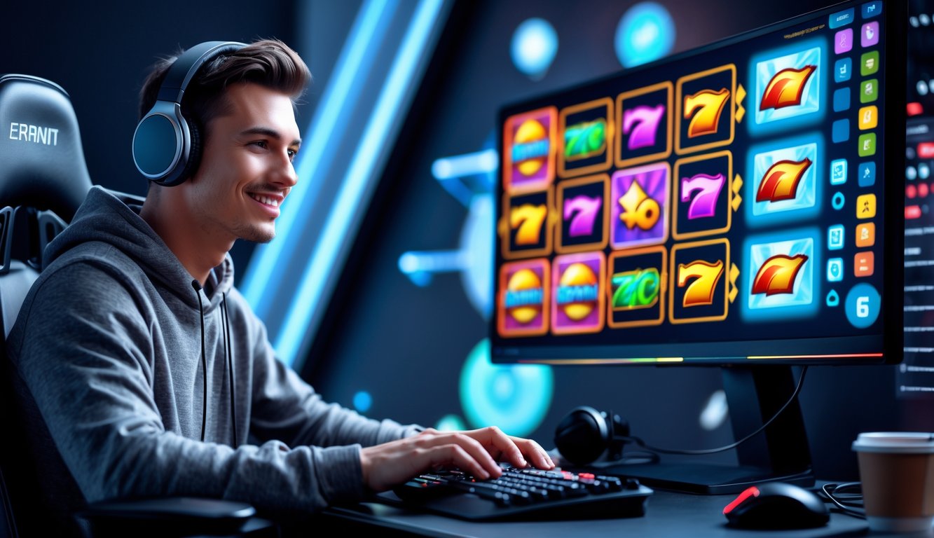 Seorang dewasa muda duduk di depan komputer dengan tampilan mesin slot online, terlihat fokus dan senang bermain game.