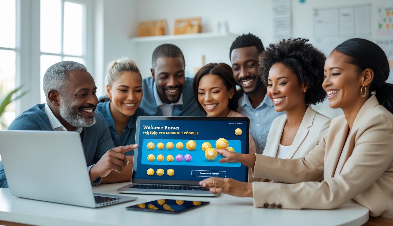 Sekelompok orang tersenyum menggunakan laptop dan ponsel di ruang tamu yang terang, menunjukkan suasana senang dan percaya diri saat bermain lotere online.