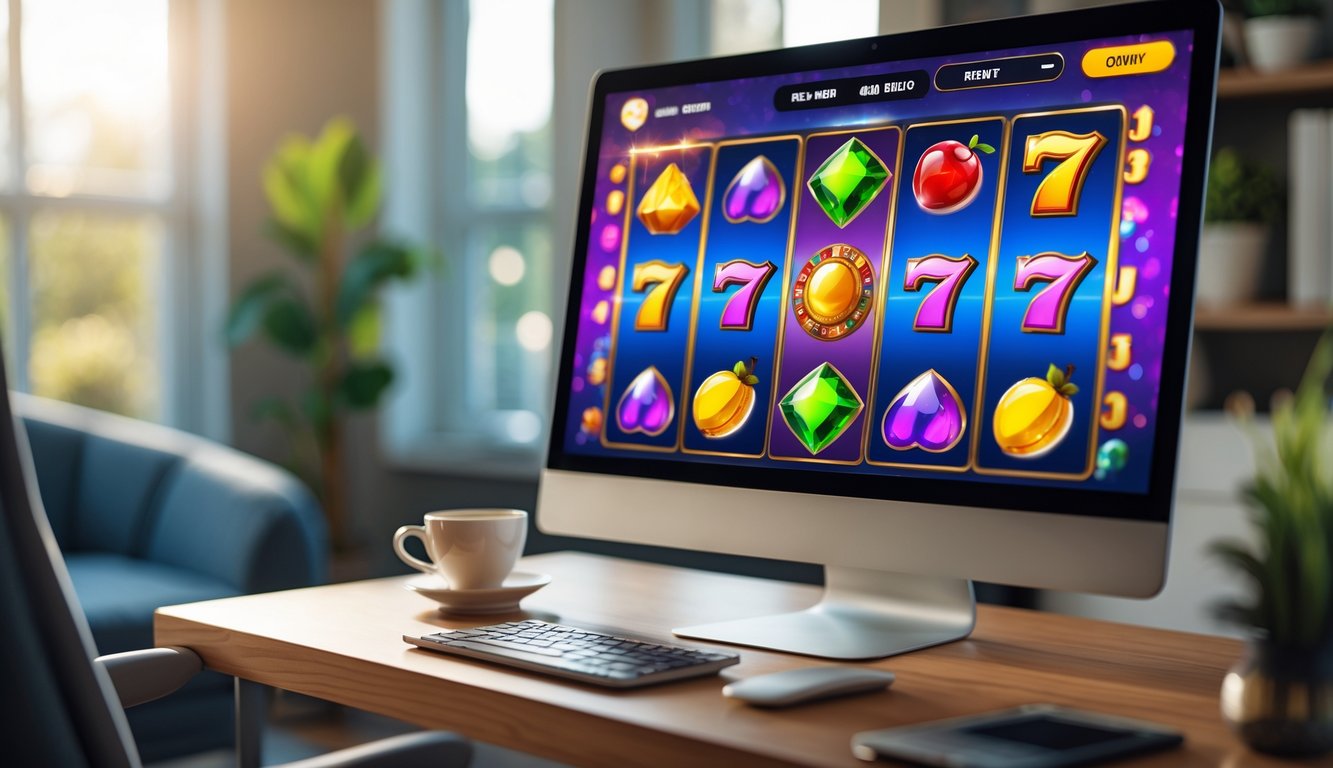 Layar komputer menampilkan permainan slot online dengan simbol warna-warni di ruang kerja yang nyaman dan terang.